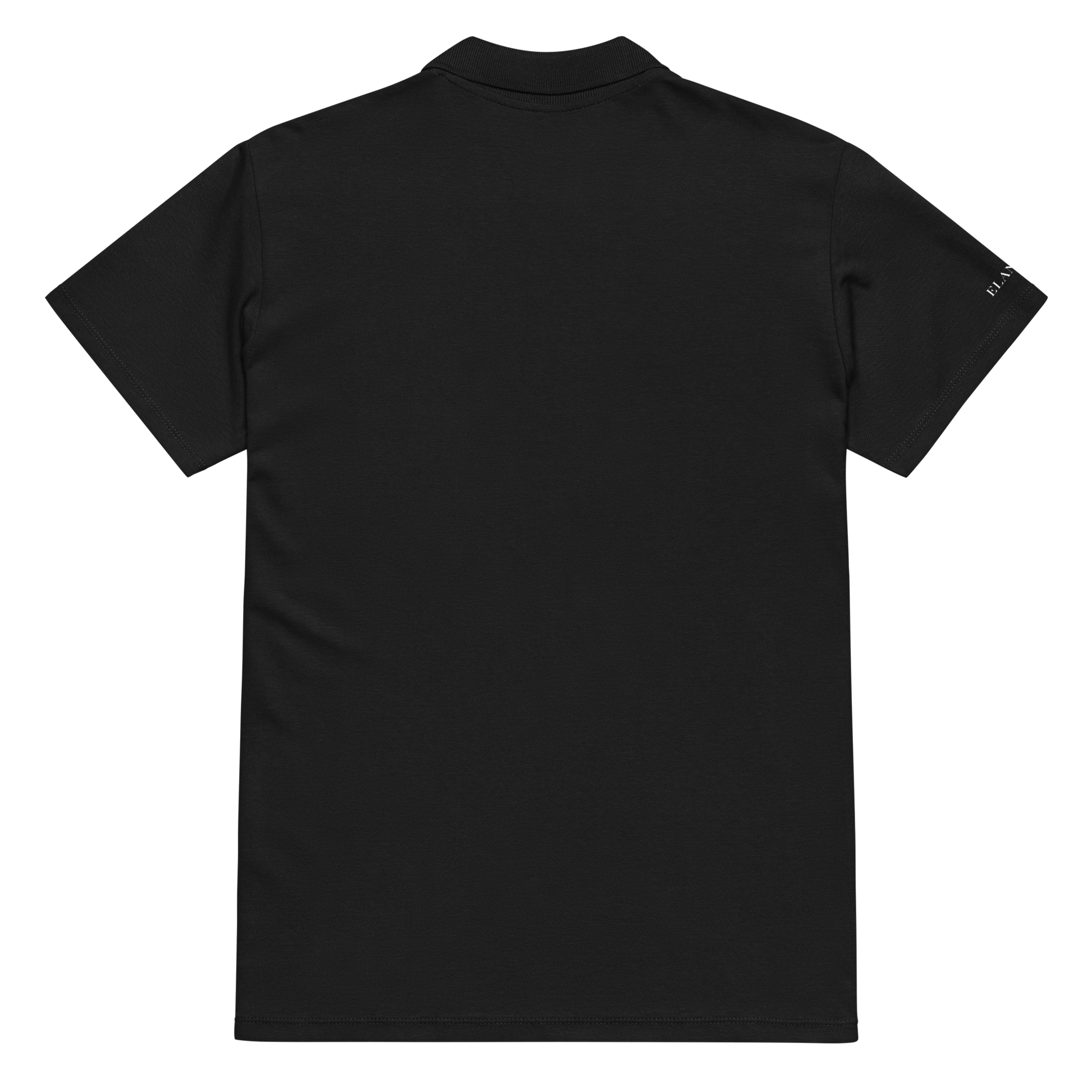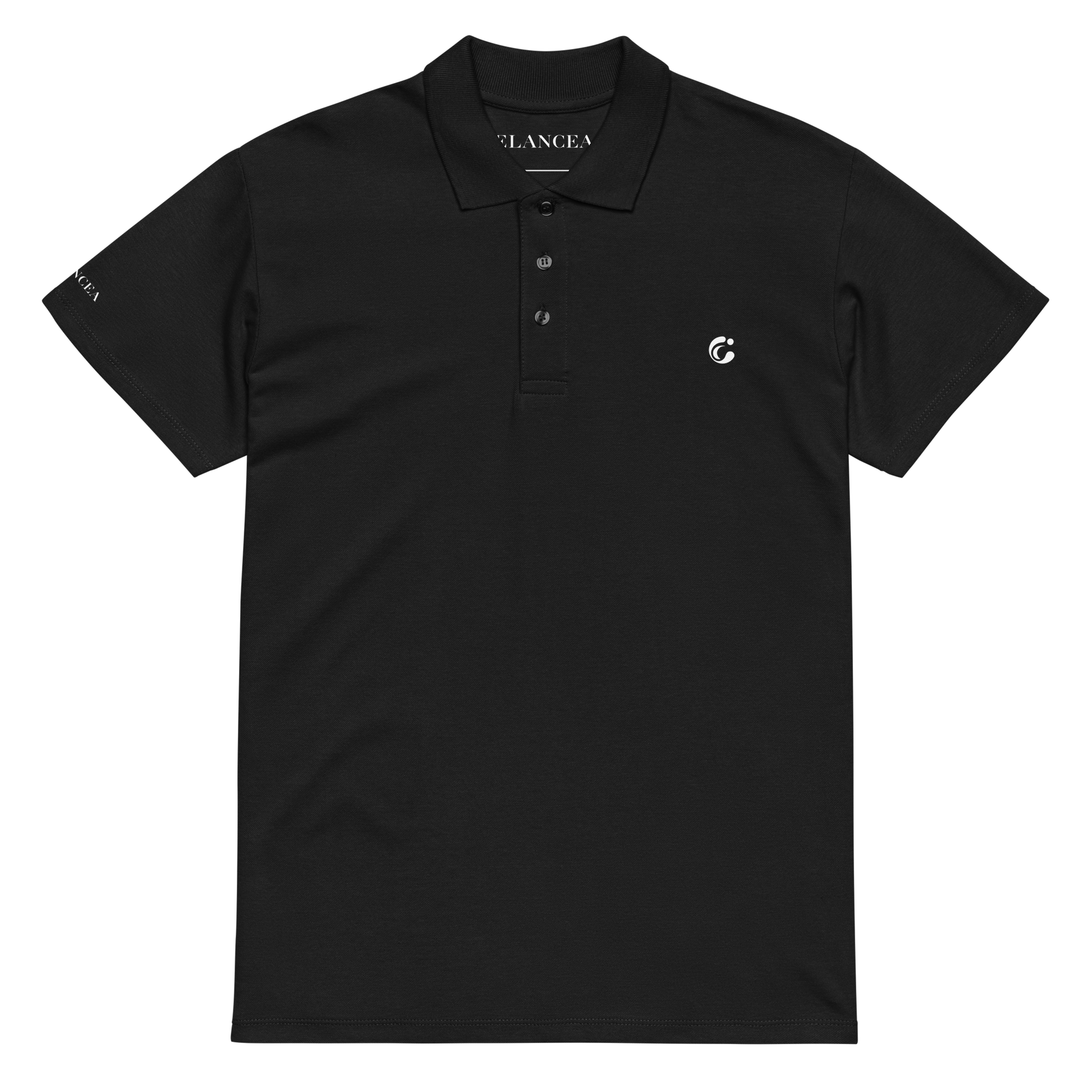 Schwarzes Poloshirt - kleines Logo auf linker Brust, kleines Logo auf rechter Schulter und Ton-in-Ton gestaltete 3-Knopfleiste.