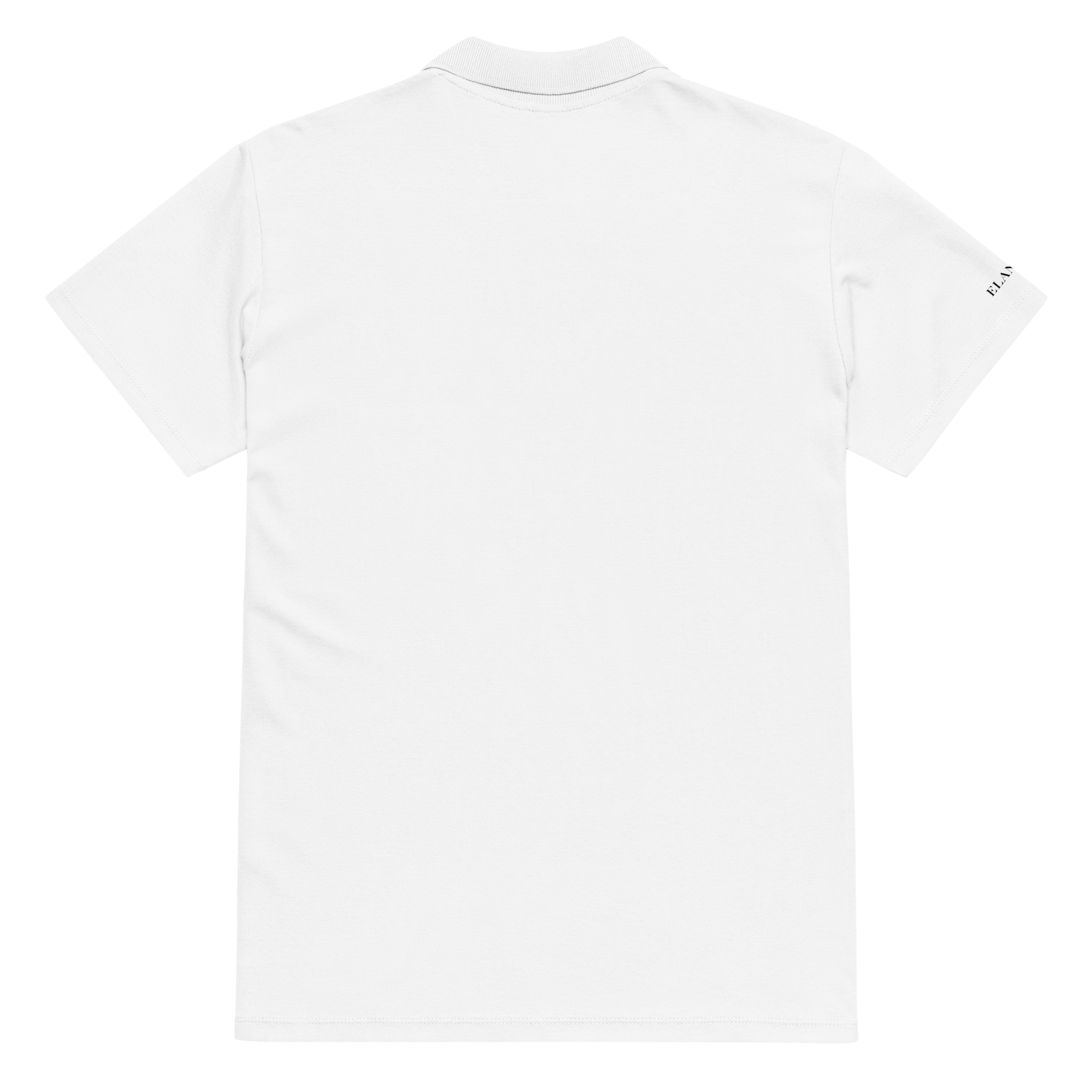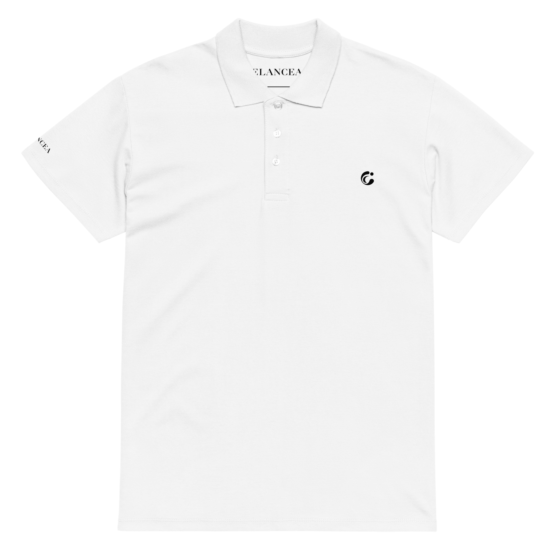 Weißes Poloshirt - kleines Logo auf linker Brust, kleines Logo auf rechter Schulter und Ton-in-Ton gestaltete 3-Knopfleiste.