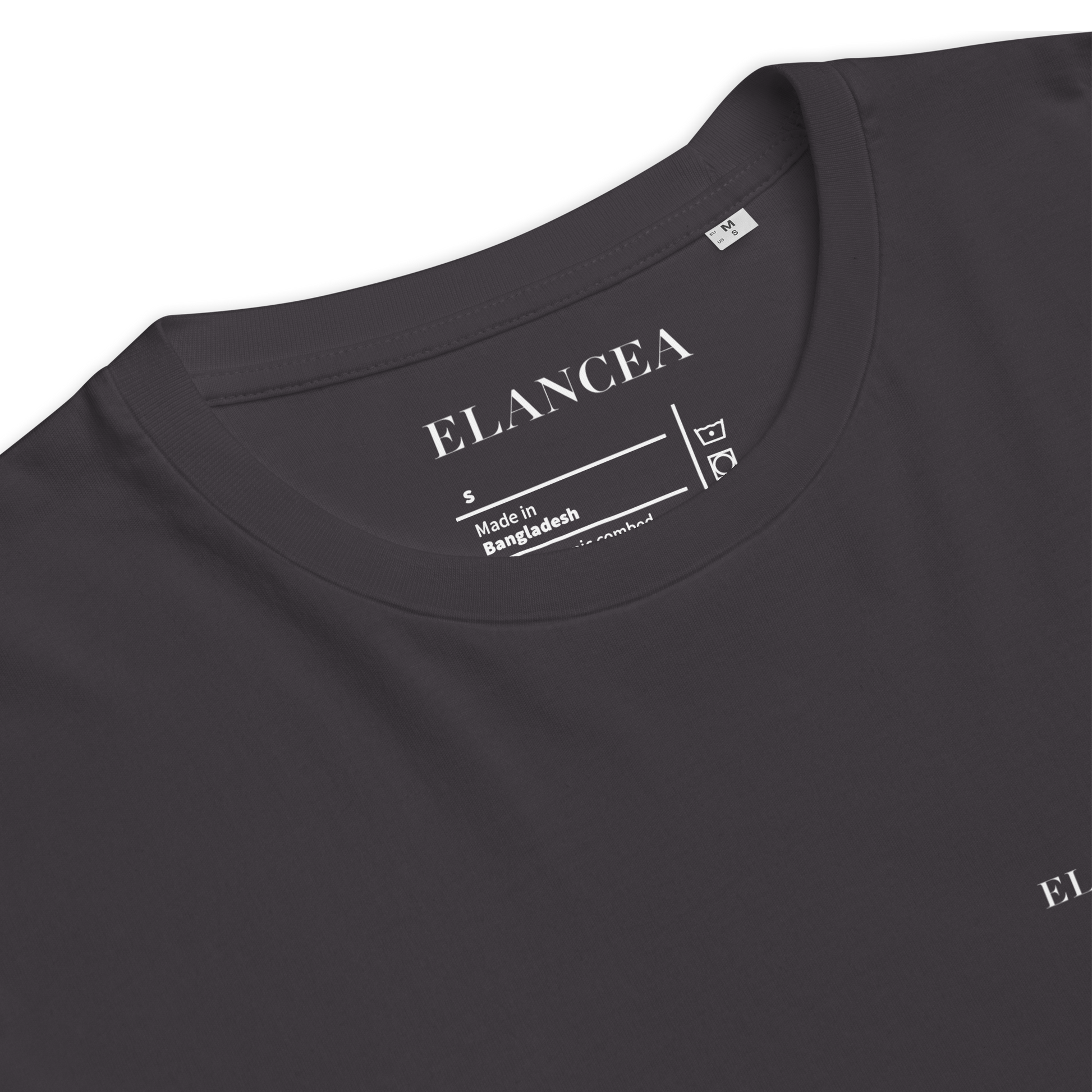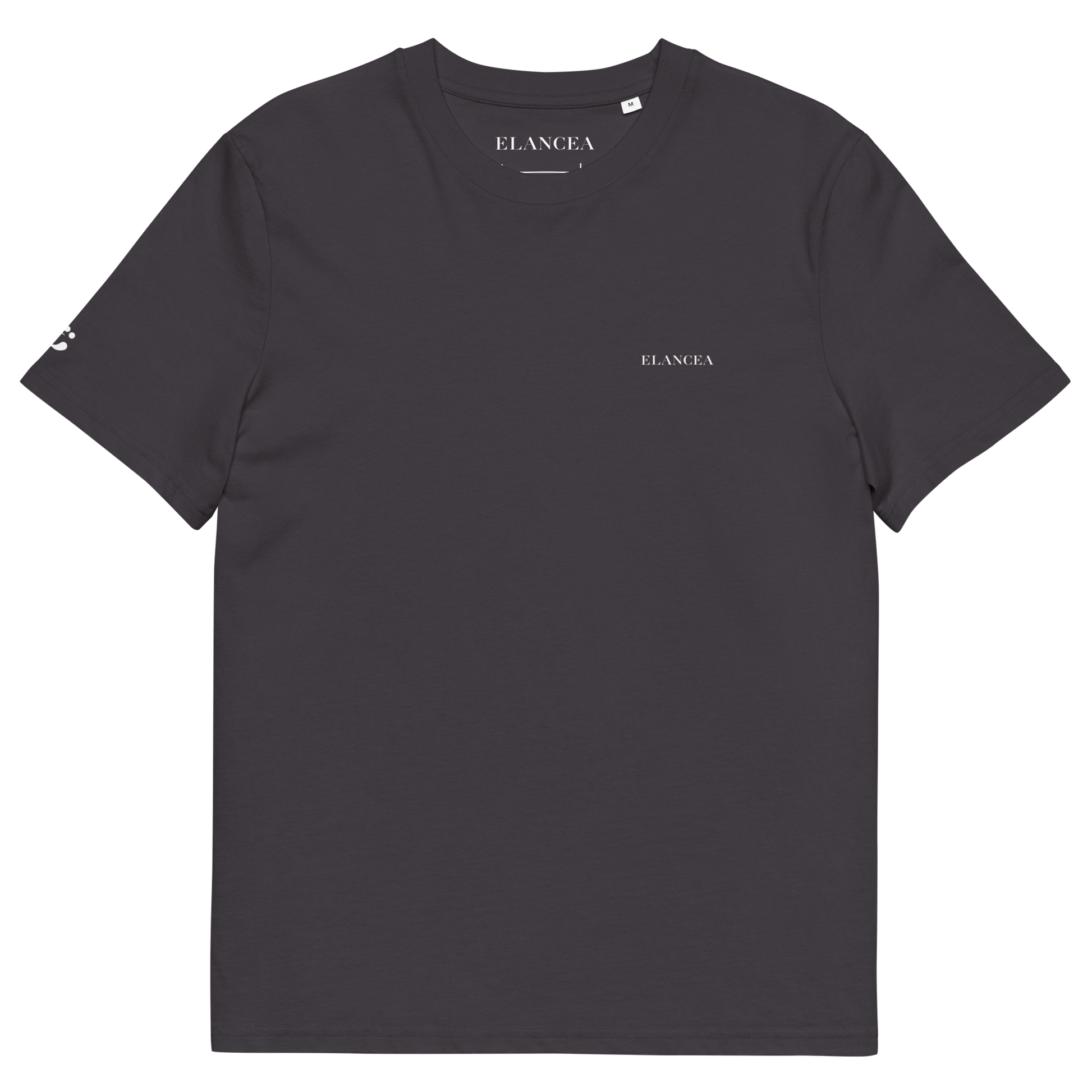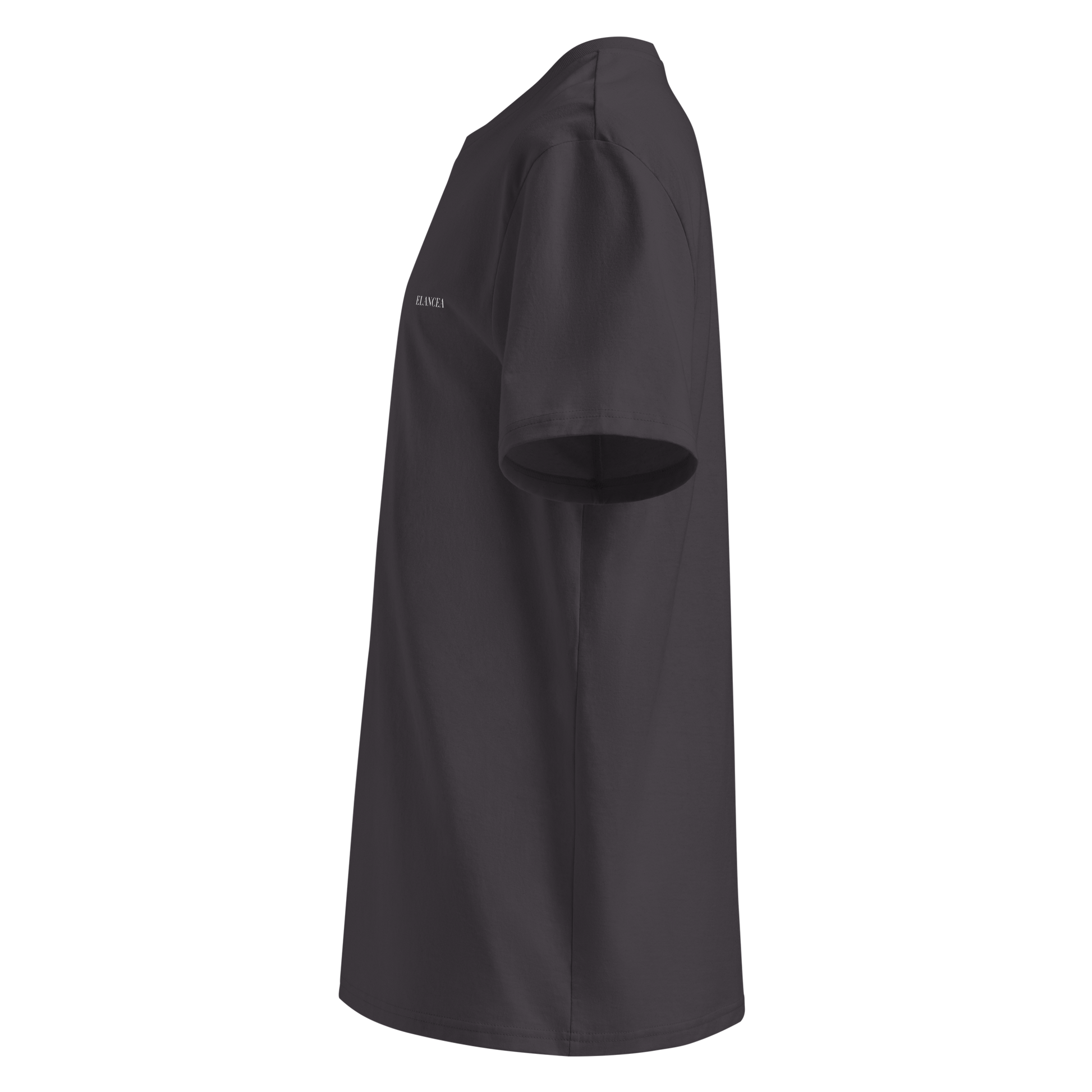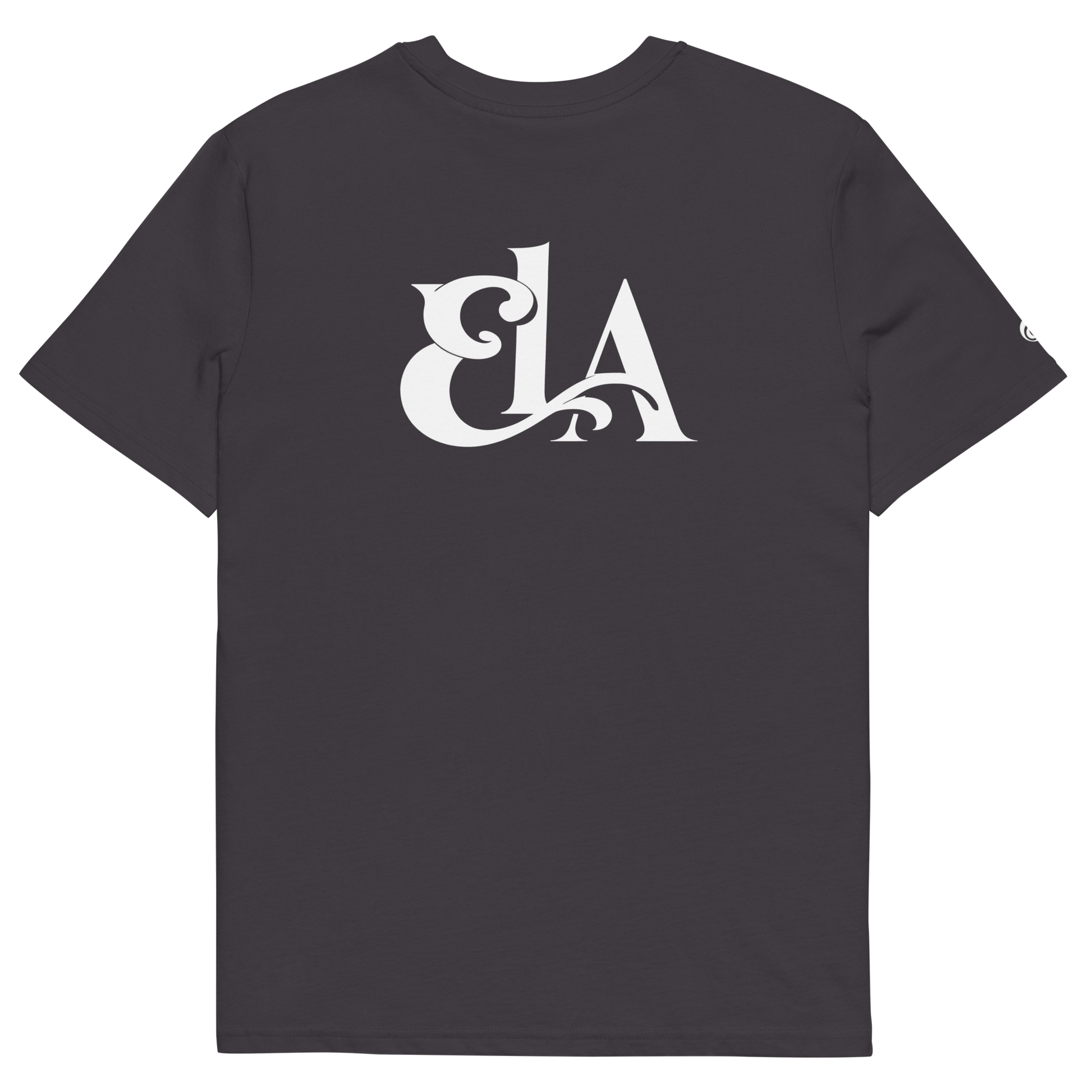Anthracite Tee - kleines Logo linke Brust, ELA Logo oberer Rücken, kleines Logo rechte Schulter.