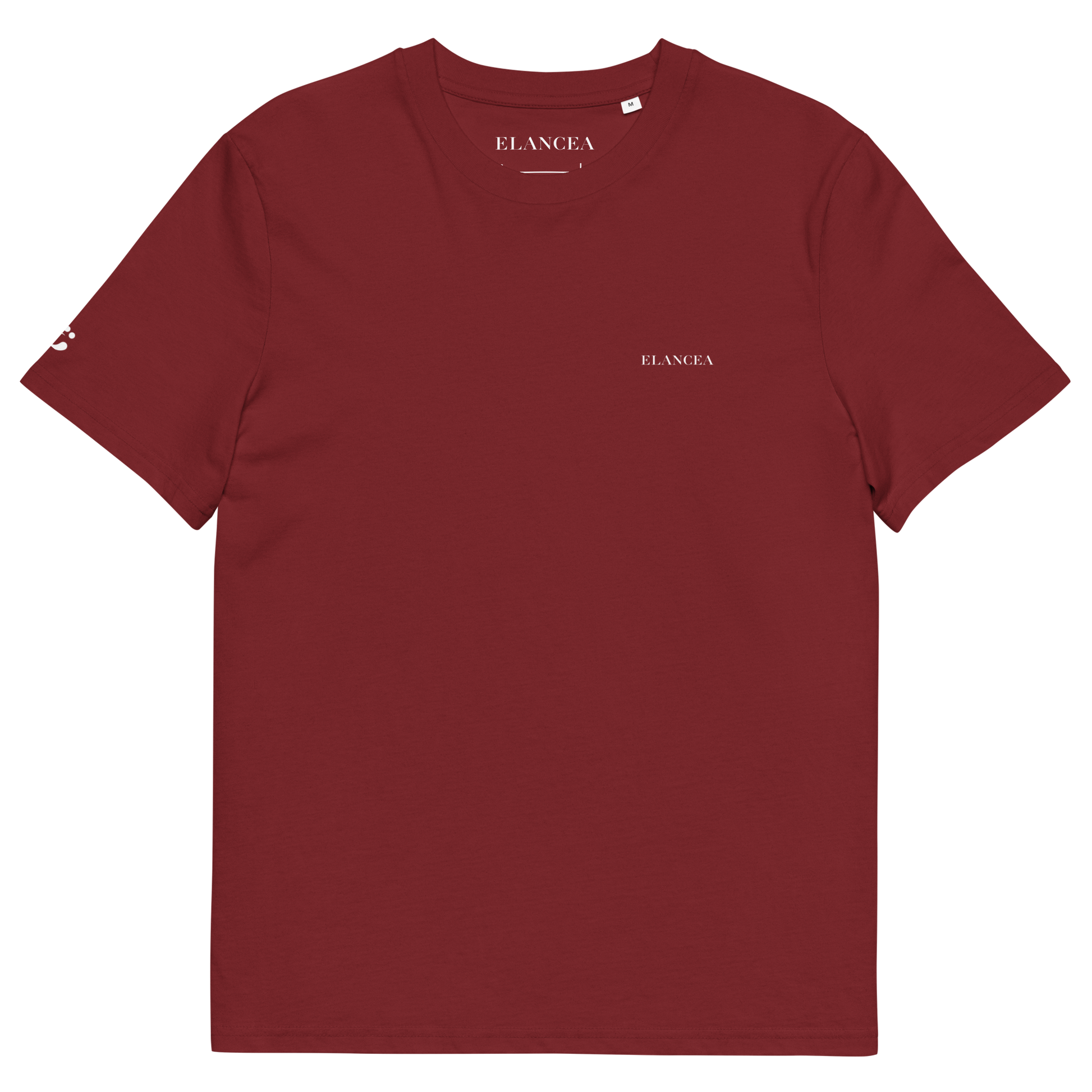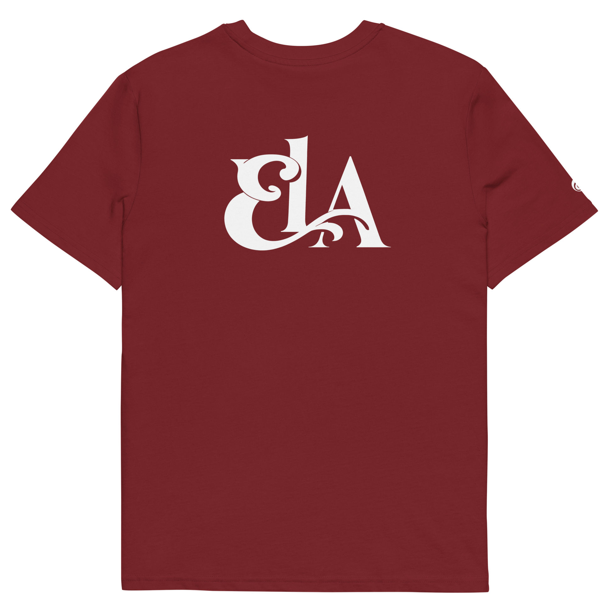 Burgundy Tee - kleines Logo linke Brust, ELA Logo oberer Rücken, kleines Logo rechte Schulter.